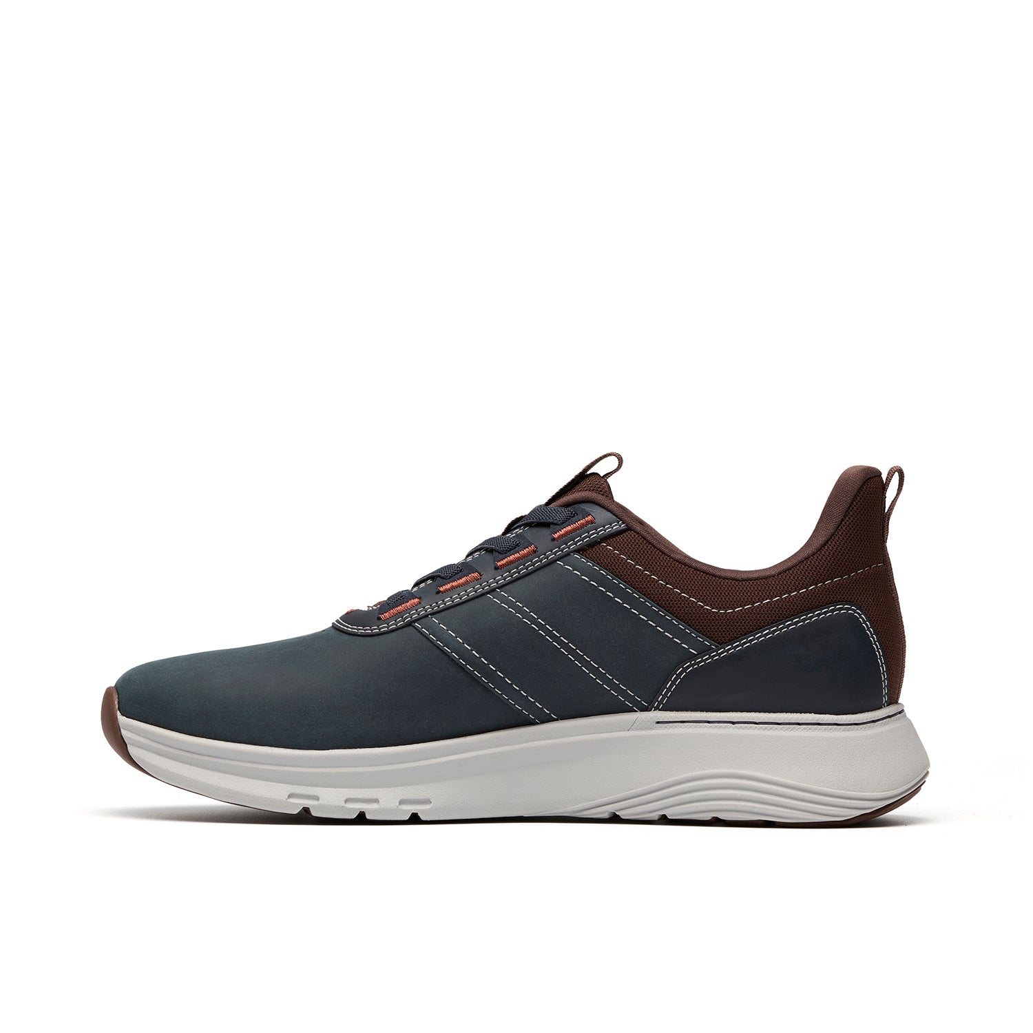 Motion Trek LX is our sports-inspired casual shoe, perfect for laid-back athleisure style. This profile balances casual and athletic aesthetics with clever upper panelling and a versatile navy colourway. Its wedge profile and runner-inspired toe bump lend a sporty look, making it a great transitional option for various occasions.