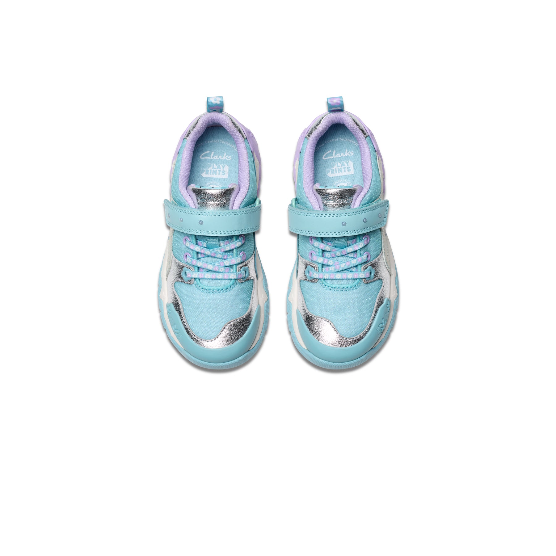 - Mix material light blue glitter mesh, leather and rubber upper Adjustable rip tape fastening and interest elastic lacing make it easy to pop on and off and provide a secure, personalised fit